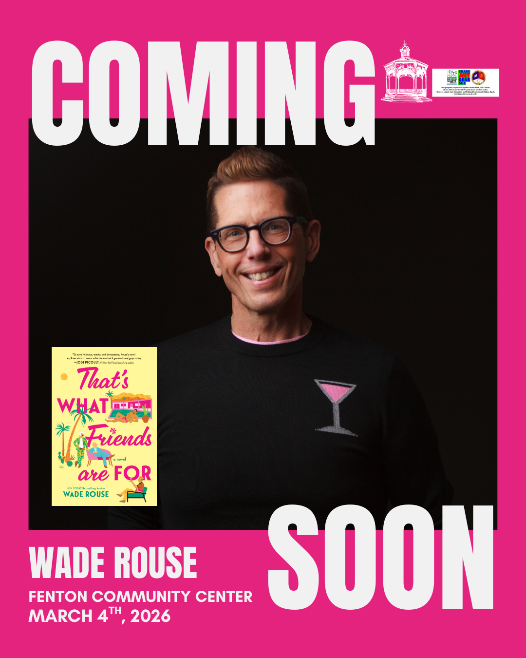 Join the Arts and Culture Commission for the debut of Wade Rouse's newest novel, "That's What Friends Are For," on March 4th, 2026. All participants will receive a signed hardcover copy of his book and have an opportunity to hear excerpts from the story while enjoying sweet treats and drinks- all for only $40 per person!